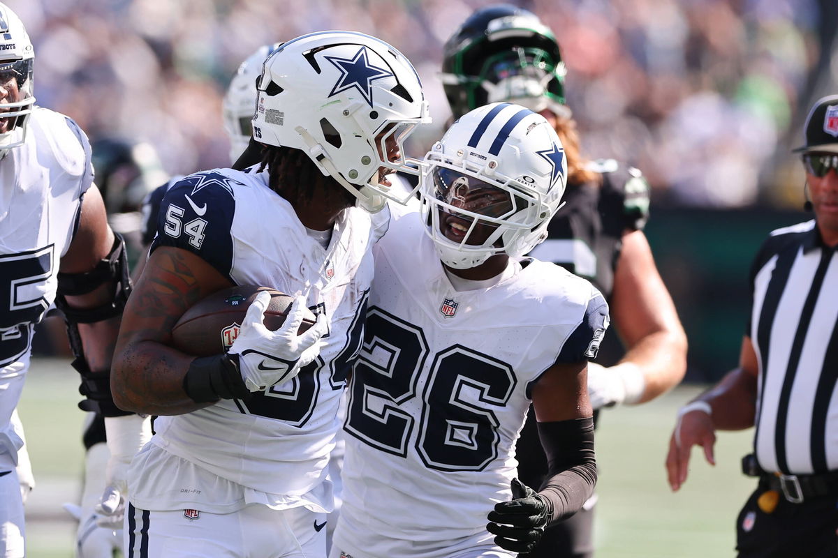 TOBER 05: Sam Williams 54 of the Dallas Cowboys celebrates with Daron Bland 26 after recovering a fumble during the second quarter of the game against the New York Jets on October 5, 2025 at MetLife Stadium in East Rutherford, New Jersey. Photo by Rich Graessle/Icon Sportswire NFL, American Football Herren, USA OCT 05 Cowboys at Jets EDITORIAL USE ONLY Icon25100519120