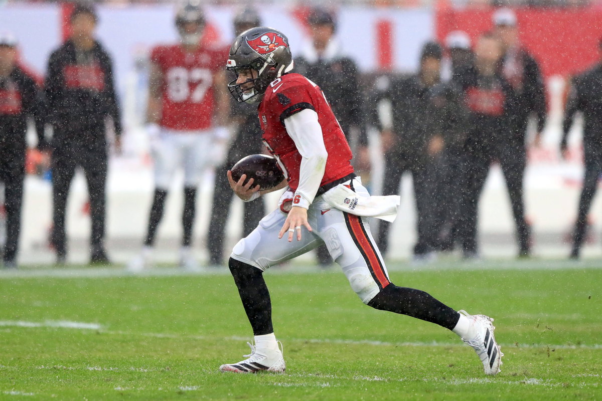 TAMPA, FL – JANUARY 03: Tampa Bay Buccaneers Quarterback Baker Mayfield 6 scrambles for yardage during the NFL, American Football Herren, USA game between the Carolina Panthers and the Tampa Bay Buccaneers on January 03, 2026 at Raymond James Stadium in Tampa, Florida. Photo by Cliff Welch/Icon Sportswire NFL: JAN 03 Panthers at Buccaneers EDITORIAL USE ONLY Icon357260103021
