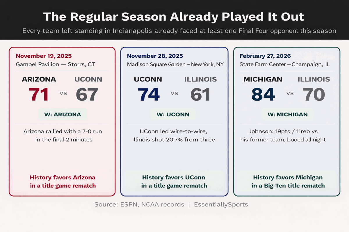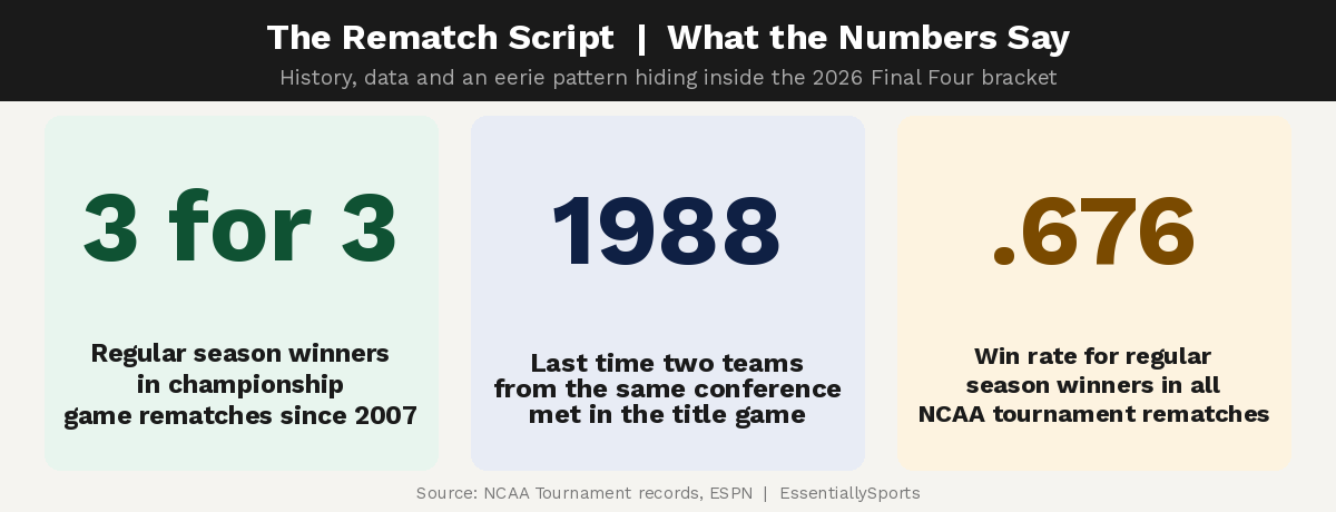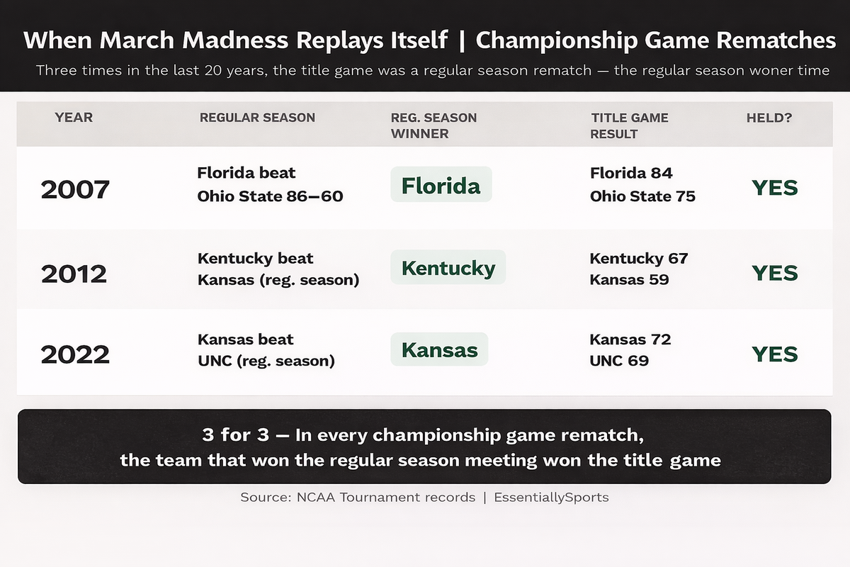 It’s happened three times in the modern era where a March Madness Finals featured two schools who squared off earlier in the campaign.