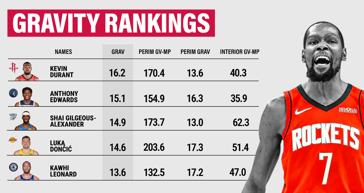Just take a look at NBA.com’s gravity rankings to see how much Durant impacts a defense. According to NBA.com, “Gravity quantifies how much a player pulls defenders towards them above expected, essentially measuring how much attention they draw compared to what the spacing on the floor predicts.”