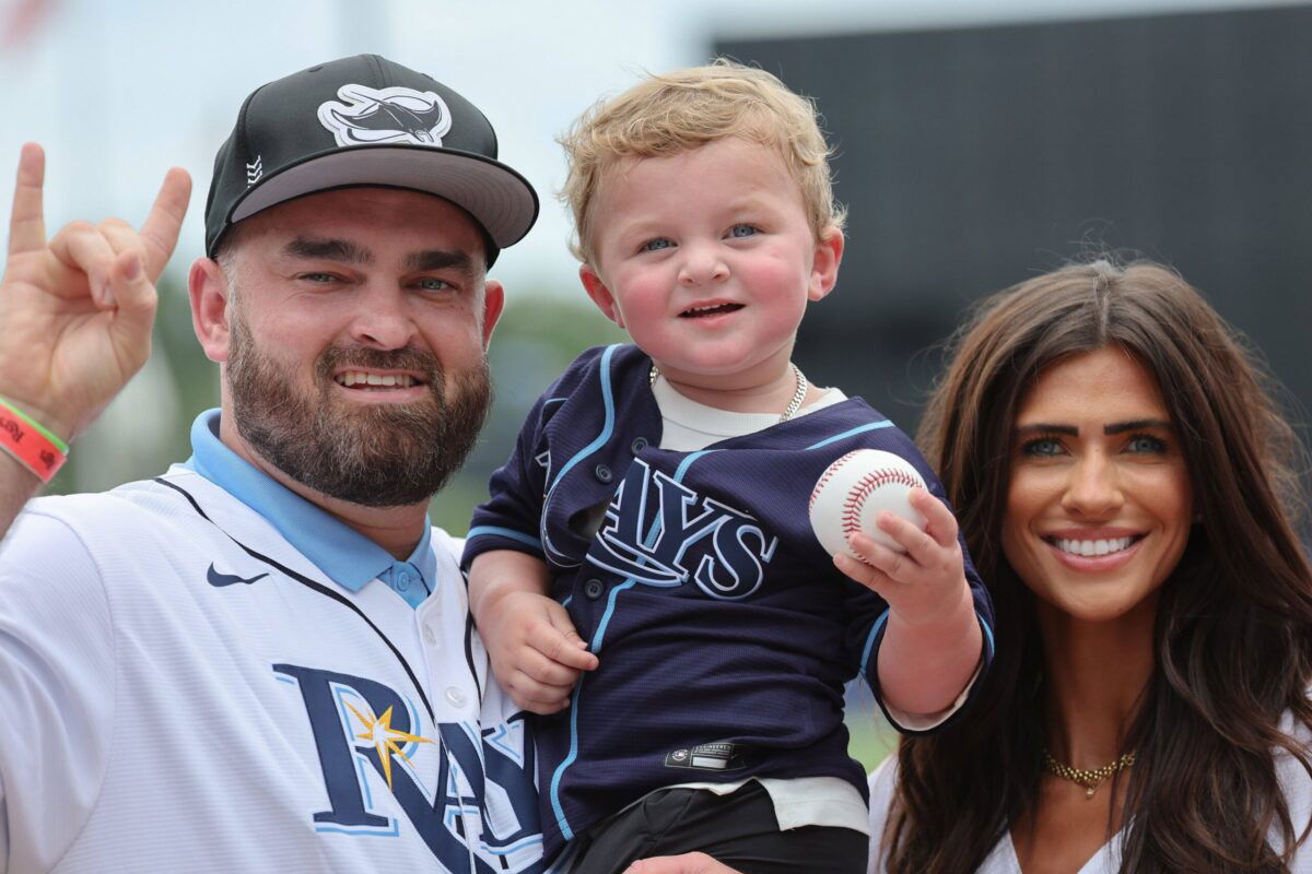 August 2, 2025, Tampa, Florida, USA: USF Mens Basketball head coach Bryan Hodgson poses for photos with his son Jett and wife Jordan after throwing the ceremonial first pitch in the game between the Tampa Bay Rays and the Los Angeles Dodgers on Saturday, Aug. 2, 2025 in Tampa. Tampa USA – ZUMAs70_ 0828597202st Copyright: xLuisxSantanax