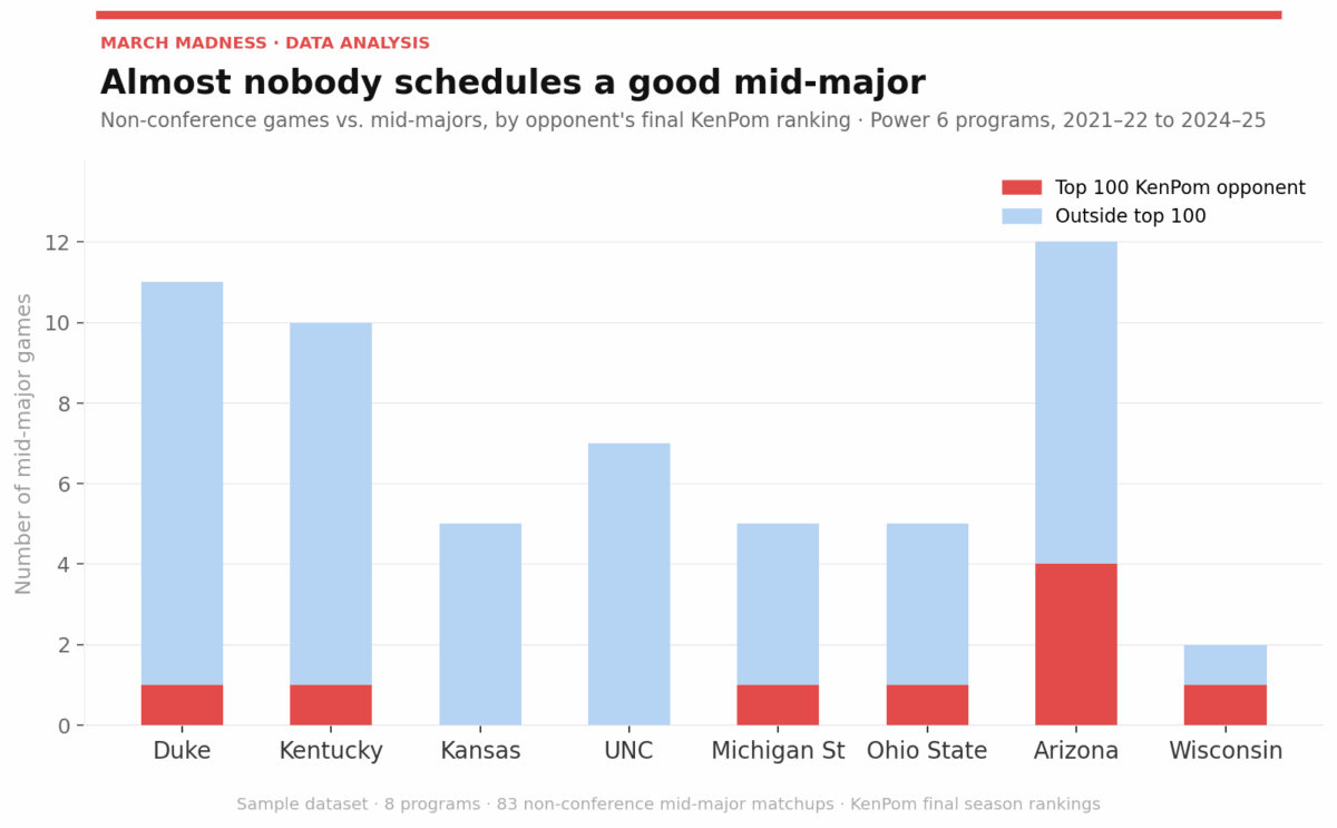 Of the 83 non-conference mid-major matchups during that timeframe, those eight elite programs combined to play just nine Mid- to Low-Major schools that were ranked in the Top-100 according to KenPom’s final season rankings.