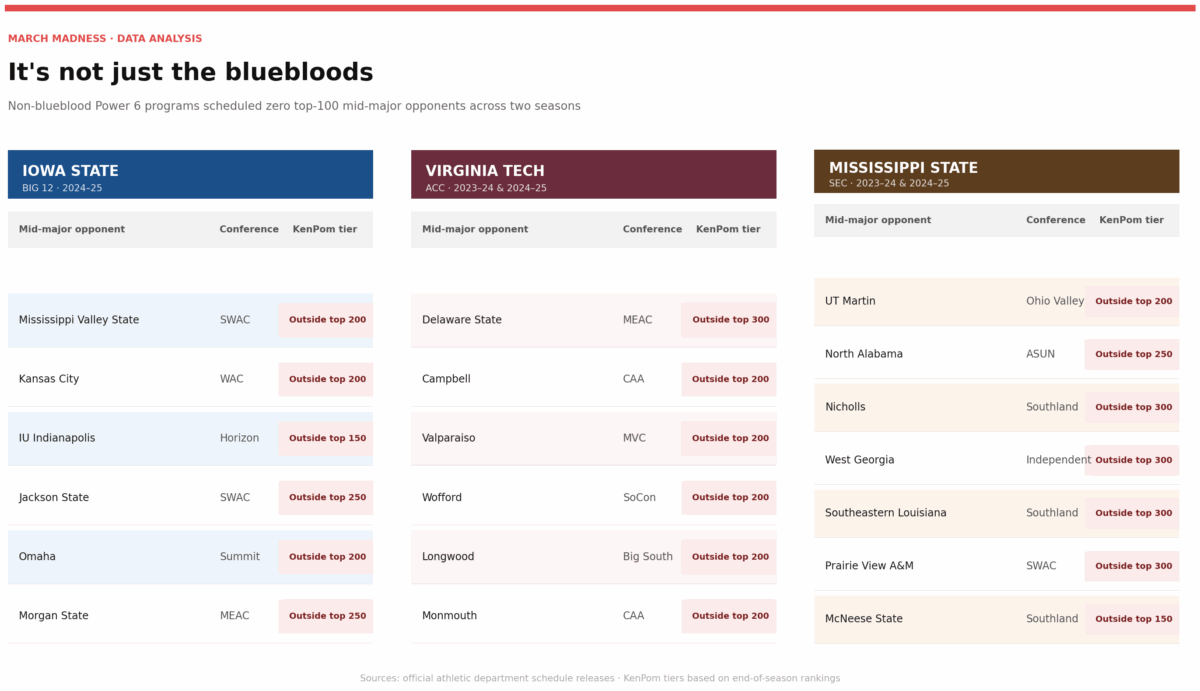 The bluebloods aren’t the only ones shunning the smaller schools. A small sample size from the ACC, Big Ten and SEC reveals a similar pattern. Between Iowa State, Mississippi State and Virginia Tech, not one of them has played a Top-100 KenPom ranked team in the last three seasons.