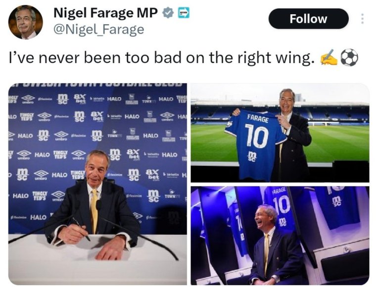 Yes, that’s the trouble with modern football – riddled with “Marxists”. But much has changed since then, not least this supposed Crystal Palace supporter adopting a new team in Ipswich Town and suggesting politics and football should mix after all. He was pictured this week at Portman Road, holding aloft a blue “Farage 10” shirt. In one photo, every shirt in the dressing room had his name plastered across the back.