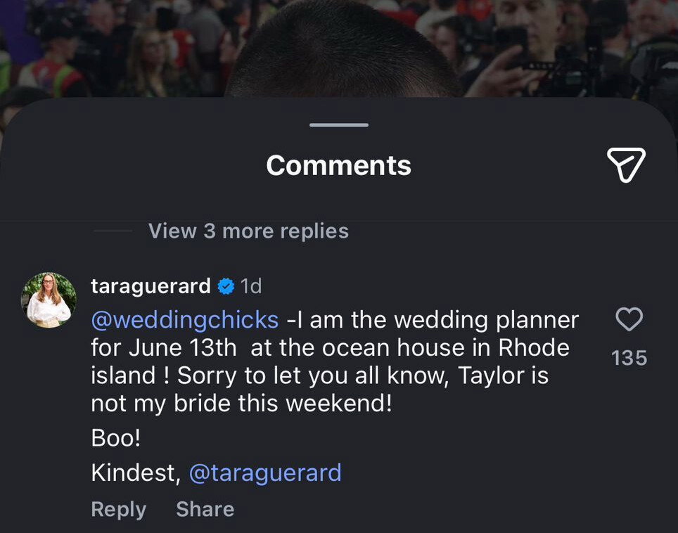 “I am the wedding planner for June 13th at the ocean house in Rhode island!” wrote the wedding planner Tara Guérard in the comment section of an Instagram post. “Sorry to let you all know, Taylor is not my bride this weekend!”