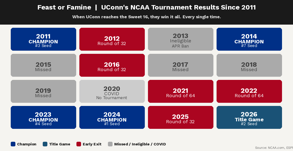 The Huskies have either won it all or bowed out before the Sweet 16 every year since the 2011 season, owning an unblemished 11-0 record during that time frame.