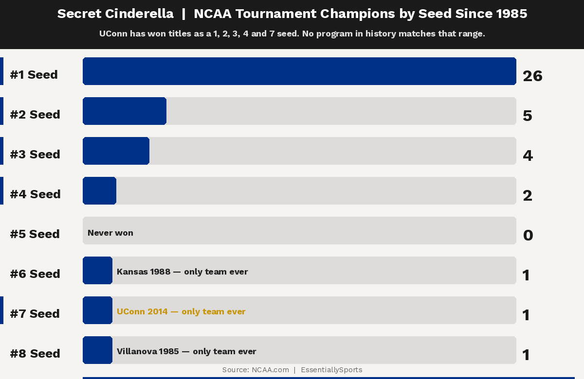In an age where No. 1 seeds win 63 percent of March Madness titles and appear in another 91 percent, UConn has built its legacy as a secret Cinderella in that no other team has taken a less traditional route to hoops immortality than the Huskies.