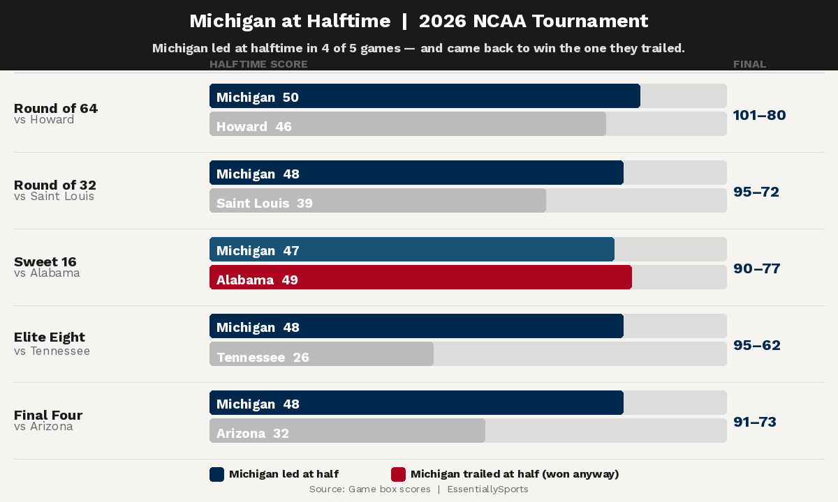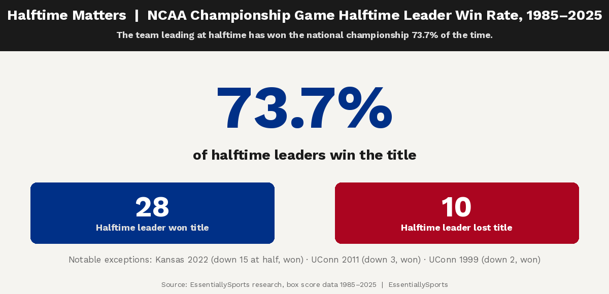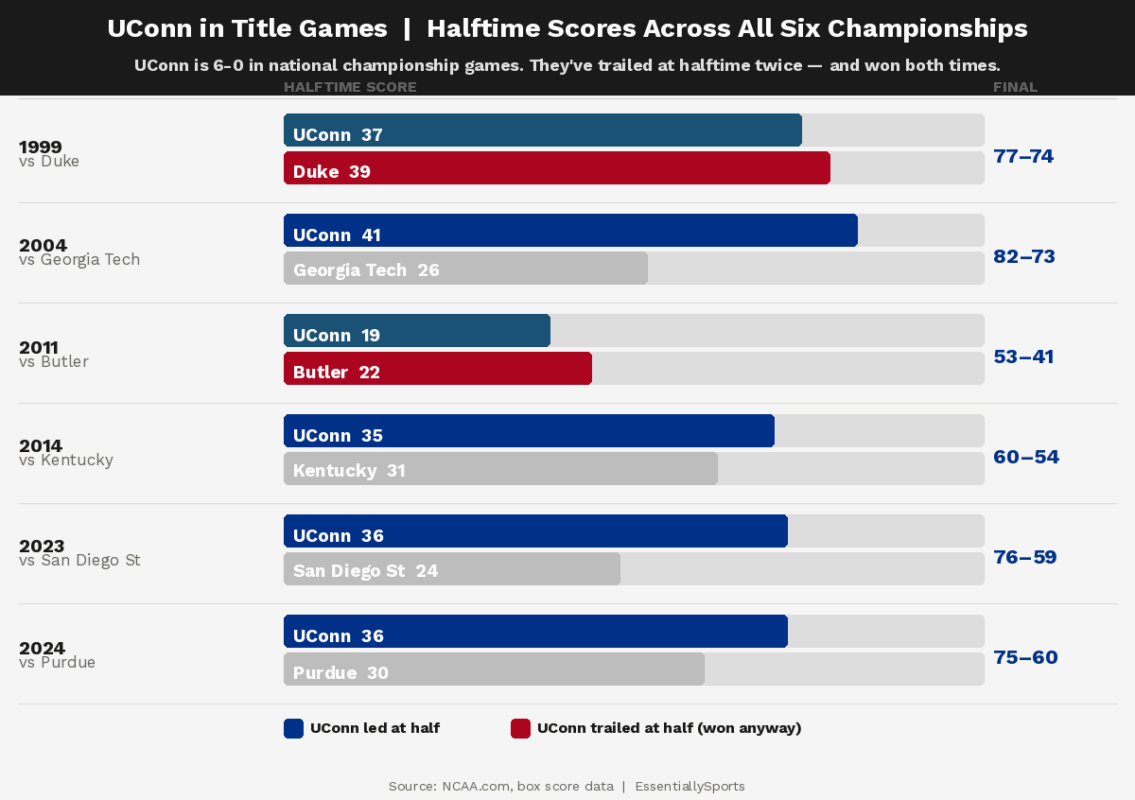 That small percentage of teams that rally from halftime deficits often relies on composure and experience, two traits UConn has consistently shown. Meanwhile, a healthy Michigan has been nearly unbeatable with a 36-3 record.