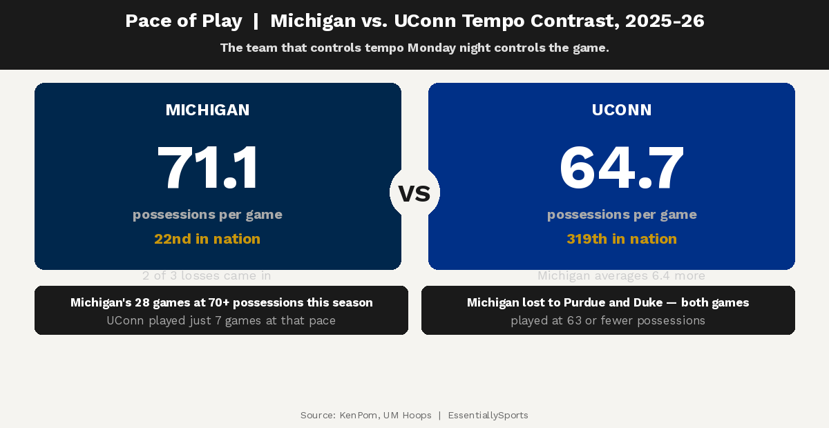 The Wolverines average 71.1 offensive possessions per game, while UConn sits at 64.7. That gap creates a clear stylistic clash, with Michigan ranking No. 22 nationally in pace and the Huskies ranking No. 319.
